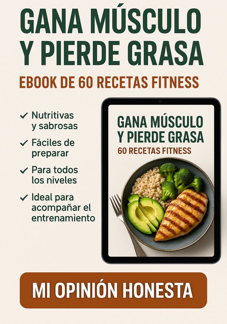 Es un libro digital (formato PDF) con 60 recetas fitness especialmente diseñadas para personas que desean aumentar masa muscular y perder grasa corporal, sin complicarse en la cocina ni seguir dietas estrictas.